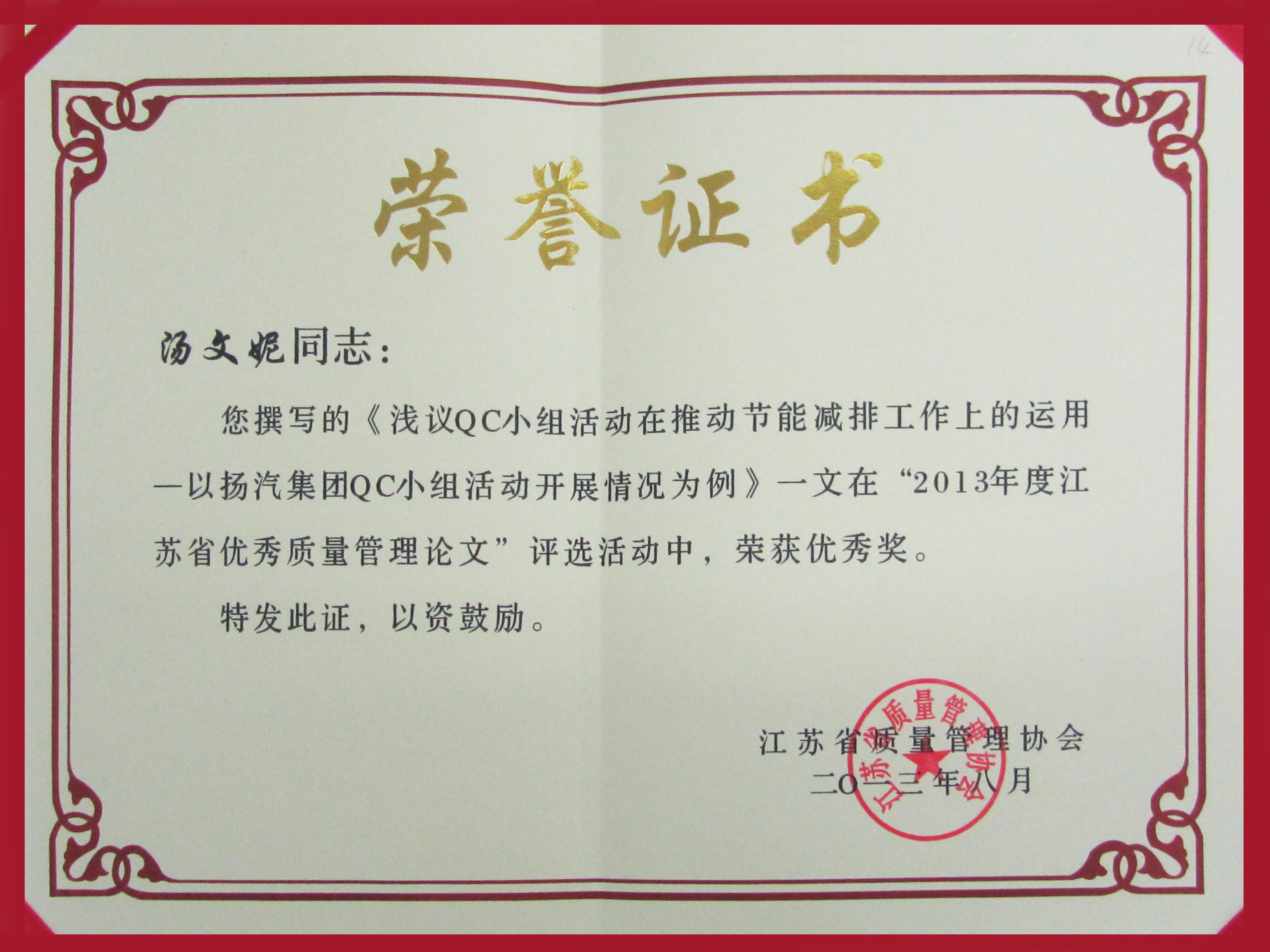 此外,集團公司企業(yè)文化策劃處湯文妮的參賽論文《淺議QC小組活動在推動節(jié)能減排工作上的運用——以揚汽集團QC小組活動開展情況為例》在“2013年度江蘇省優(yōu)秀質(zhì)量管理論文”評選活動中榮獲優(yōu)秀獎。