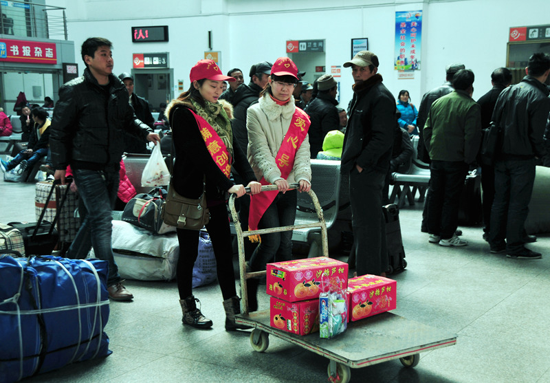 來自揚汽集團和團市委組織的志愿者們有的在進站口向旅客指引車站售票、候車等各個功能區(qū)位置;有的在服務(wù)臺回答旅客咨詢;有的在安檢處勸導(dǎo)旅客把攜帶的物品放上危險品檢查儀安檢;有的推著“雷鋒車”幫行李較多的旅客拖運箱包;有的給候車的旅客倒上一杯熱水;有的在檢票口幫助維持現(xiàn)場秩序,避免發(fā)生擁堵;還有的在候車大廳勸導(dǎo)旅客請勿吸煙……