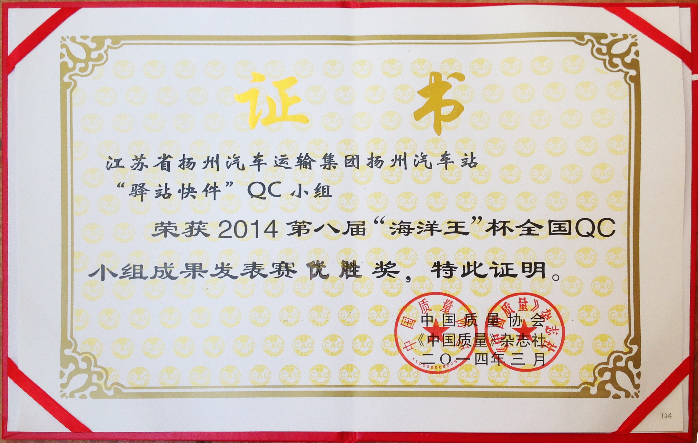 “海洋王”杯QC小組發(fā)表賽是一項全國性比賽,今年共有300多個成果報名,經(jīng)過層層選拔,來自全國各地QC小組代表500余人,197個成果參加現(xiàn)場發(fā)布。經(jīng)過5天緊張的成果發(fā)布,我司揚(yáng)州汽車站“驛站快件”QC小組成員余妍、潘潔發(fā)表的《降低到達(dá)庫收發(fā)貨的誤差率》在激烈的角逐中脫穎而出,獲得第八屆“海洋王”杯最高榮譽(yù)——優(yōu)勝獎,和其他47個成果一起被直接推薦為2014年度全國優(yōu)秀QC小組。