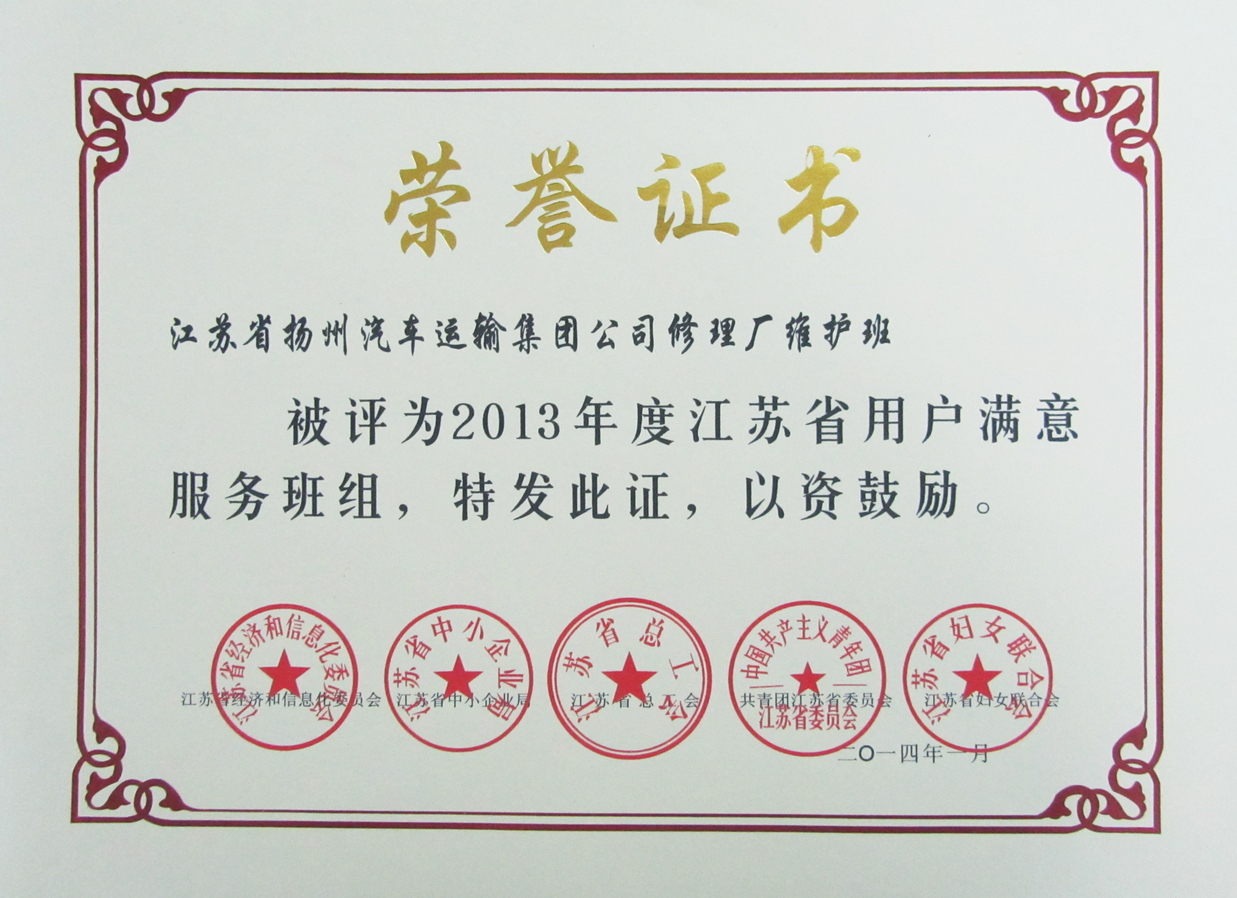 日前,由江蘇省經(jīng)濟(jì)和信息化委員會(huì)、江蘇省總工會(huì)、江蘇省中小企業(yè)局等五家單位聯(lián)合開展的2013年度創(chuàng)建“用戶滿意服務(wù)”活動(dòng)評(píng)審結(jié)果揭曉,我司修理廠維護(hù)班榮獲2013年度江蘇省“用戶滿意服務(wù)”班組,快客分公司殷鑫同志榮獲2013年度江蘇省“用戶滿意服務(wù)”明星稱號(hào)。