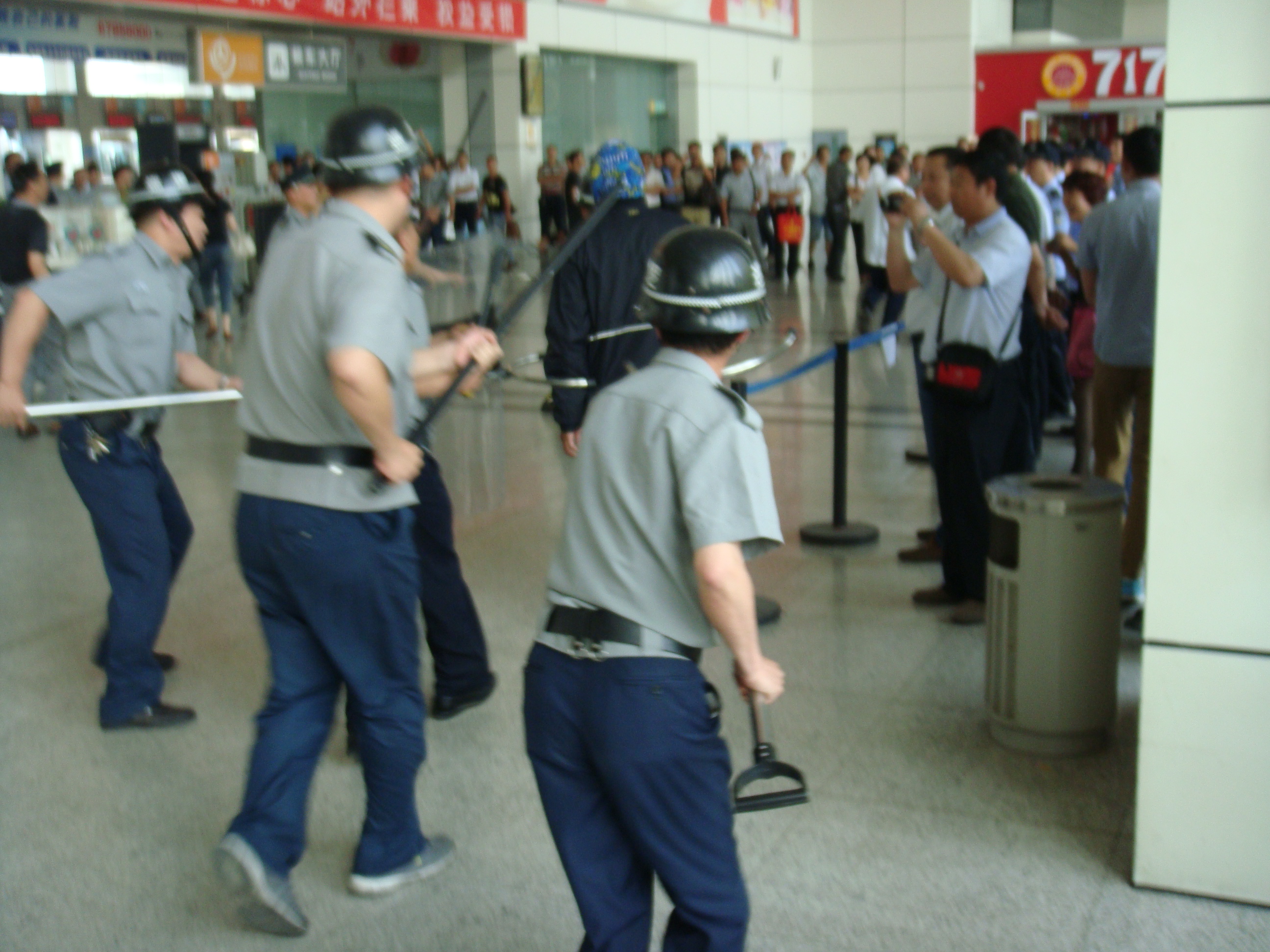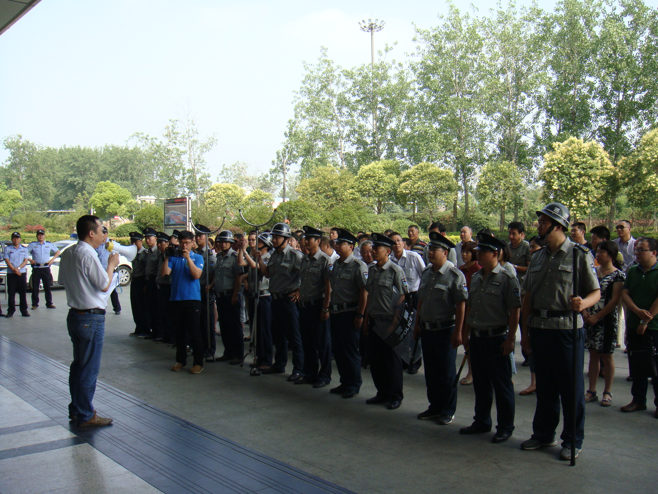 6月12日下午4點05分,演練模擬了揚(yáng)州汽車東站售票大廳里兩名手持砍刀的歹徒正往候車廳方向晃悠,值班保安發(fā)現(xiàn)這一險情后,車站迅速啟動應(yīng)急預(yù)案,車站保衛(wèi)人員協(xié)同車站一線職工緊急疏散乘客,使乘客有序、安全撤離現(xiàn)場,隨即,6名防暴隊員手持鋼叉、齊眉棍、警棍,將兩名手拿砍刀的暴徒團(tuán)團(tuán)圍住,經(jīng)過短短幾分鐘的對持和搏斗,兩名歹徒終于被制服,并被隨后趕來的民警帶走……