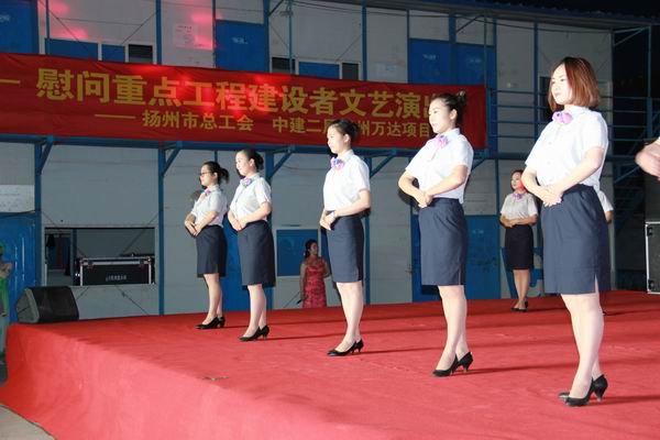 5月3日晚,由揚(yáng)州市總工會(huì)主辦、揚(yáng)州市建設(shè)產(chǎn)業(yè)工會(huì)承辦的“建設(shè)者之歌”——慰問重點(diǎn)工程建設(shè)者文藝演出,在揚(yáng)州萬達(dá)廣場(chǎng)項(xiàng)目部生活區(qū)隆重舉行。我公司參演的《七彩揚(yáng)汽——員工行為規(guī)范操》得到了在場(chǎng)領(lǐng)導(dǎo)和工程建設(shè)者的一致好評(píng)。市總工會(huì)副主席洪慧娟,市建設(shè)產(chǎn)業(yè)工會(huì)主任田繼榮,市交通產(chǎn)業(yè)集團(tuán)黨委副書記、紀(jì)委書記、工會(huì)主席王寧生等領(lǐng)導(dǎo)出席了晚會(huì)。