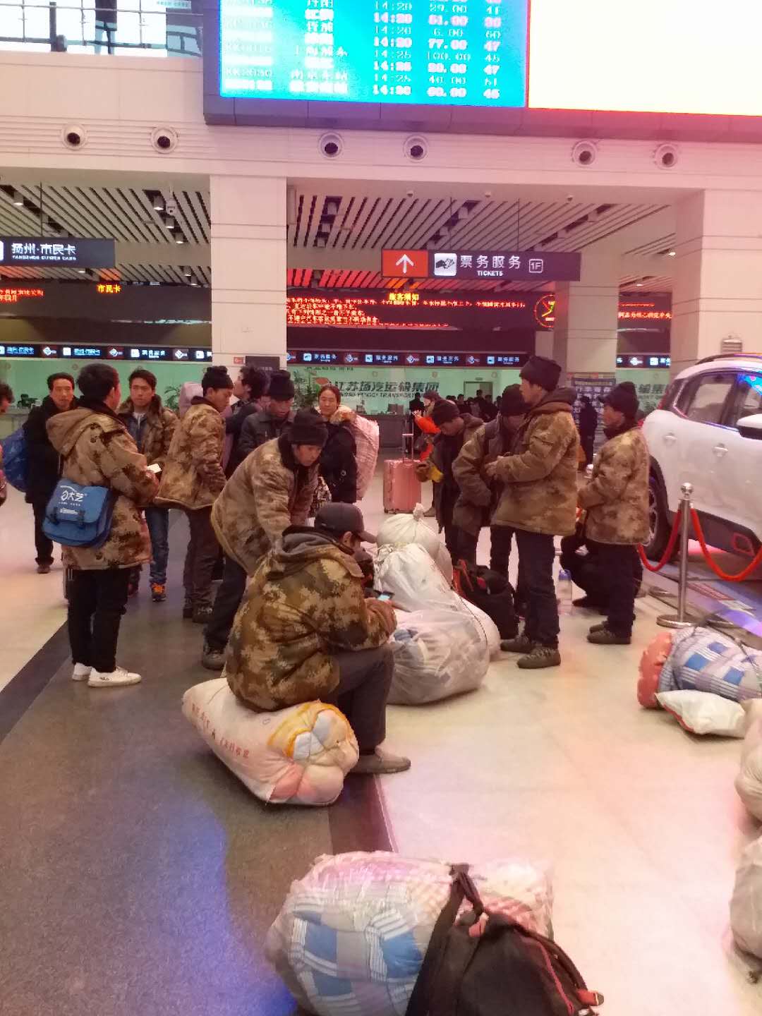 21位在揚(yáng)州某工地打工的安徽無為縣農(nóng)民工,昨天工地開始放假,于是今天大家集中提前返鄉(xiāng)。得知情況后,班長(zhǎng)尹海霞便帶領(lǐng)工作人員熱情地幫助大家購買起票來,為節(jié)約因排隊(duì)造成的時(shí)間緊張,尹班長(zhǎng)隨即吩咐班組人員利用工友的手機(jī),幫助農(nóng)民工進(jìn)行網(wǎng)上購票,不到二十分鐘,解決了農(nóng)民兄弟的購票問題。隨行中一位已在揚(yáng)州打工三個(gè)年頭的“小工頭”夏師傅感慨萬千,動(dòng)情地說:“沒想到今年春運(yùn)前買車票這么容易,多虧了車站工作人員的幫忙”。