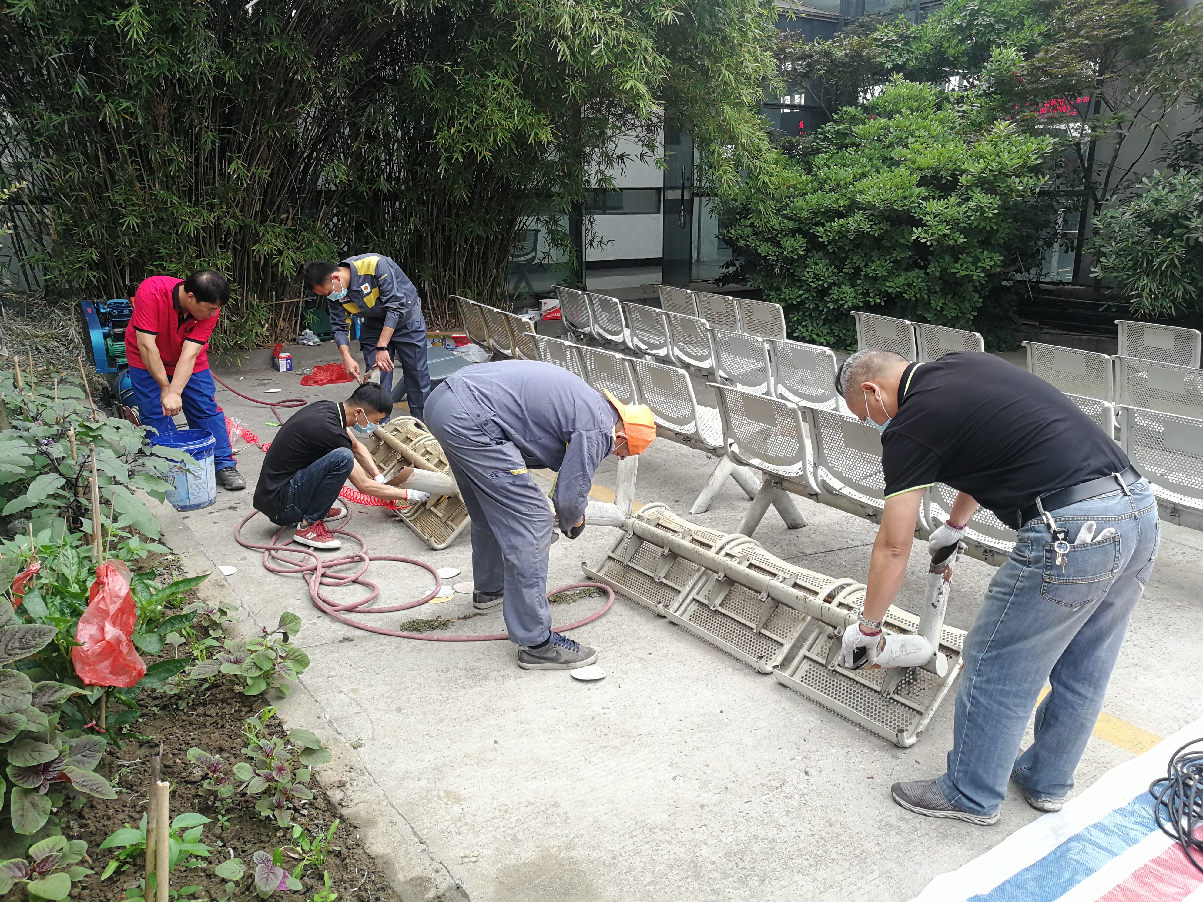 修理廠(chǎng)在接到江都分公司的任務(wù)請(qǐng)?jiān),指派江都維修點(diǎn),抽調(diào)總廠(chǎng)黨員骨干成立12人的突擊隊(duì)執(zhí)行這項(xiàng)任務(wù)。5月31日至6月1日兩天,從早上7點(diǎn)到晚上7點(diǎn),突擊隊(duì)按照計(jì)劃分工明確,分成兩支隊(duì)伍同時(shí)進(jìn)行,江都維修點(diǎn)負(fù)責(zé)座椅搬運(yùn)、打磨、水洗、噴漆、歸位等系列工作,修理總廠(chǎng)負(fù)責(zé)車(chē)輛通道設(shè)計(jì)、標(biāo)識(shí)、噴字以及停車(chē)位劃線(xiàn)任務(wù)。