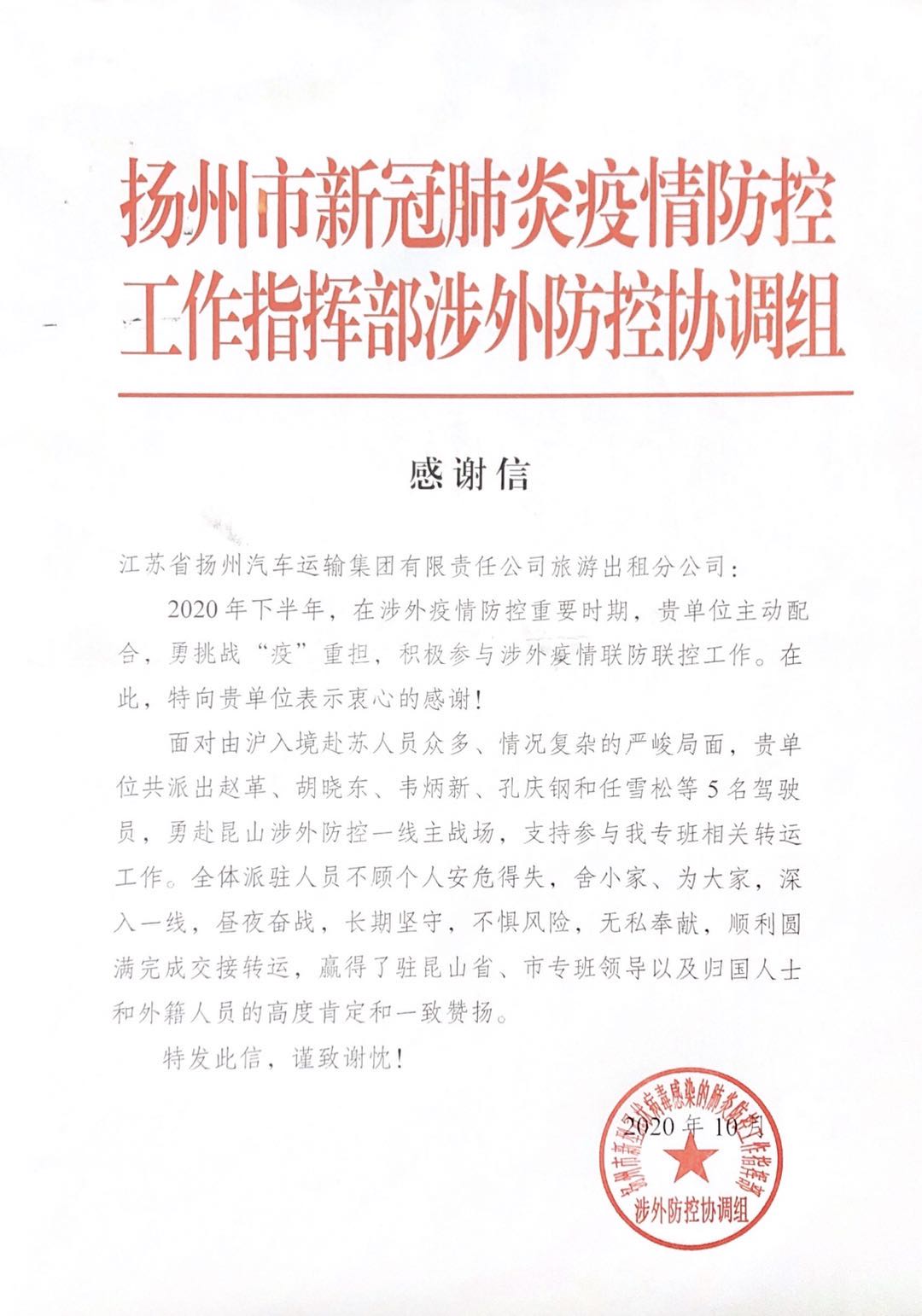 十月下旬,一封承載著市疫情防控指揮部贊譽(yù)的感謝信送至旅游出租分公司。疫情防控指揮部對(duì)第二批參加境外返揚(yáng)人員轉(zhuǎn)運(yùn)工作的五名駕駛員給予了高度評(píng)價(jià),信中表示,他們?cè)诶ド缴嫱夥揽匾痪,長(zhǎng)期堅(jiān)守,晝夜奮戰(zhàn),不懼風(fēng)險(xiǎn),無私奉獻(xiàn),順利圓滿完成交接轉(zhuǎn)運(yùn),贏得市專班領(lǐng)導(dǎo)以及歸國(guó)人士和外籍人員的高度肯定和一致贊揚(yáng)。
