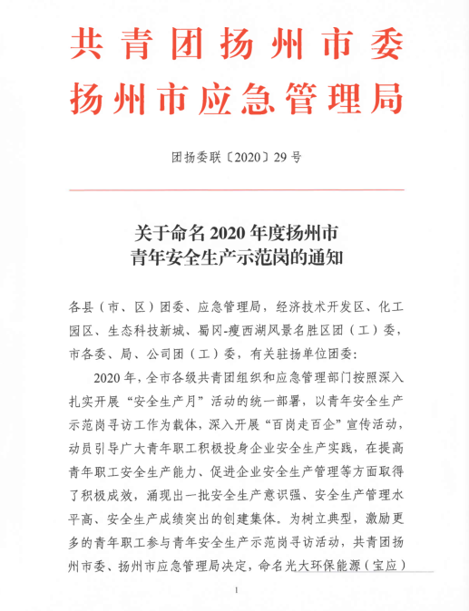 2020年,揚汽集團修理廠維護班切實落實“安全第一、服務第一、質(zhì)量第一”總目標,以突出的成績,被共青團揚州市委與揚州市應急管理局授予“揚州市青年安全生產(chǎn)示范崗”稱號。