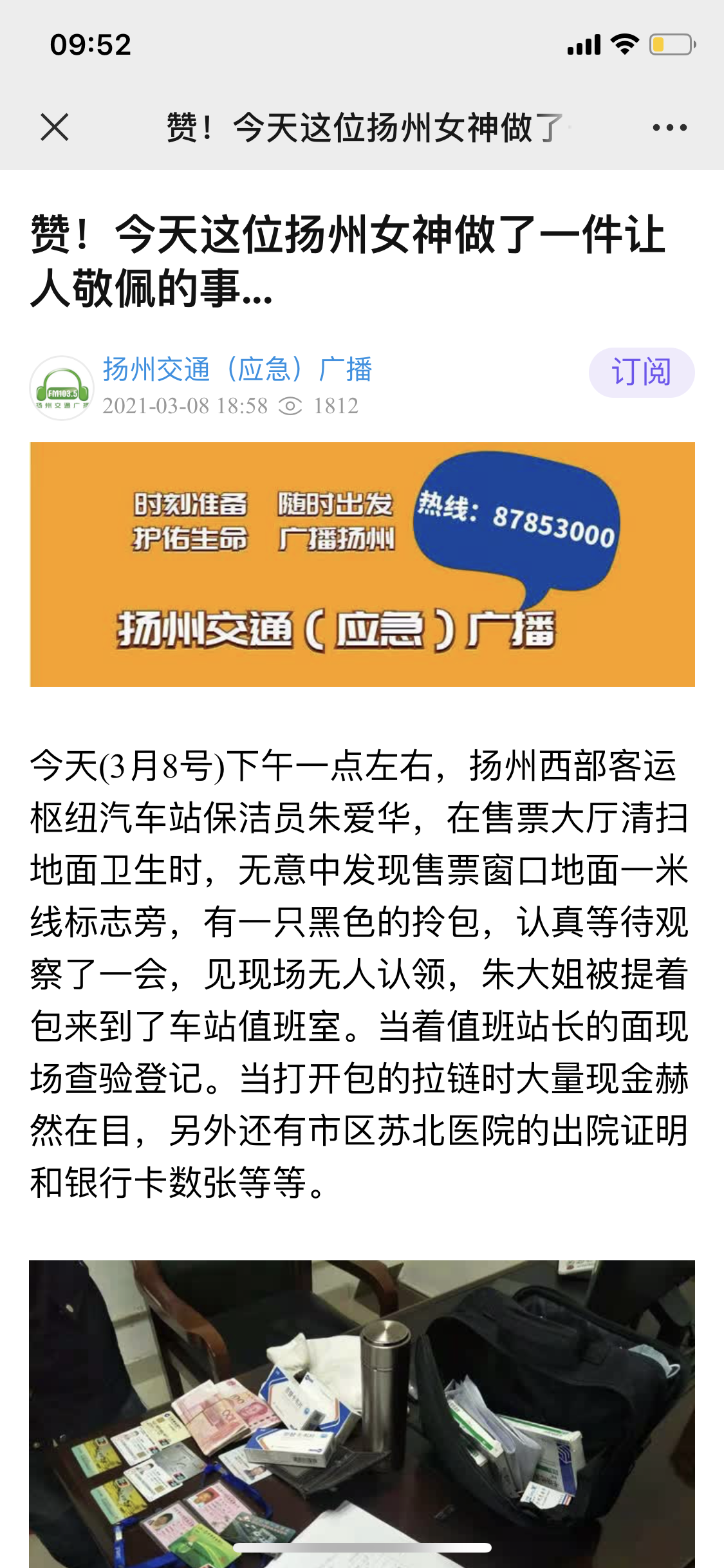 揚(yáng)州站保潔員工拾金不昧,平凡舉動獲贊揚(yáng)