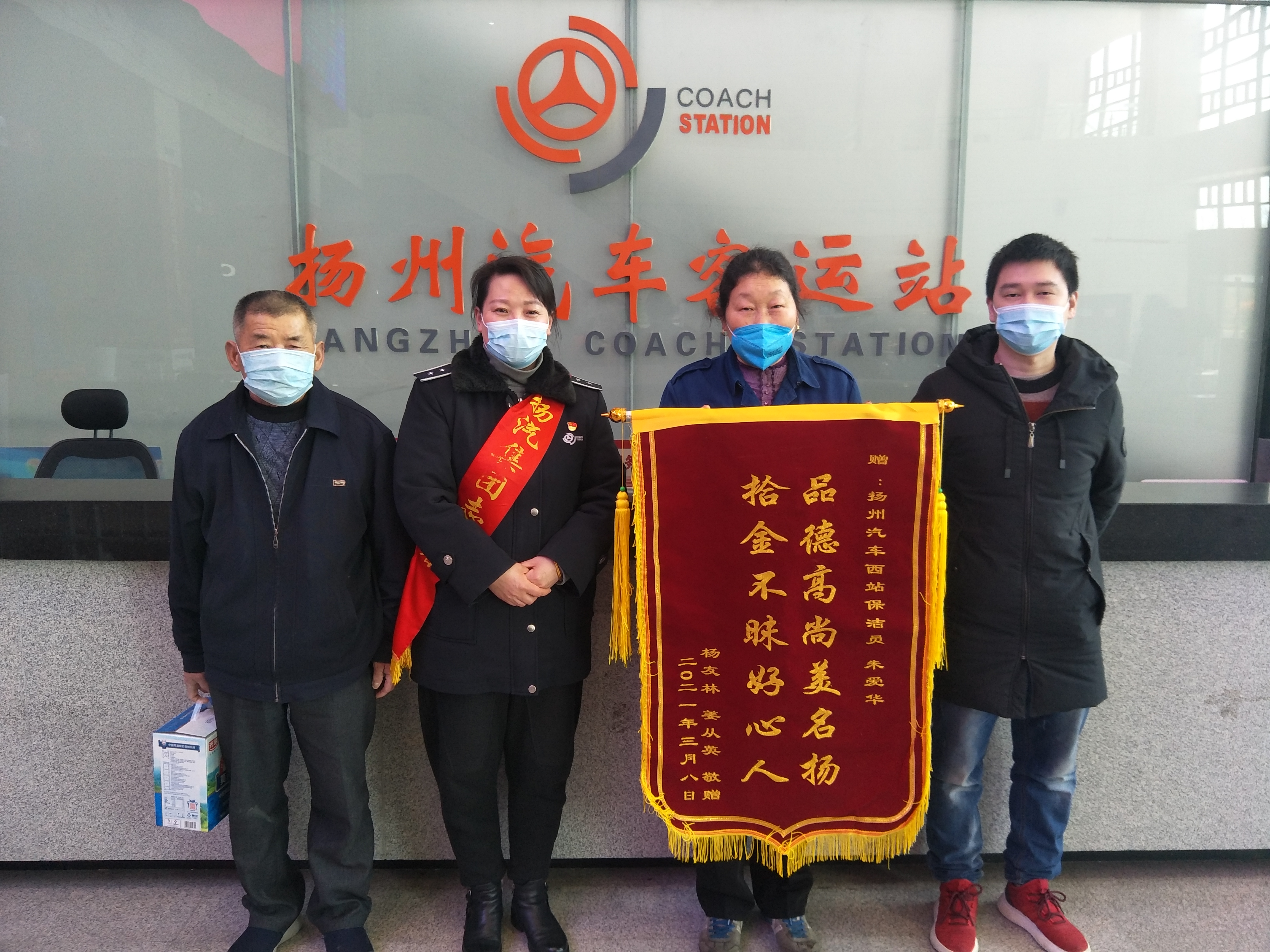 “品德高尚美名揚(yáng),拾金不昧好人心”,3月22日上午,揚(yáng)州汽車站收到一面來自旅客的錦旗,對(duì)車站保潔員朱愛華拾金不昧的品德和工作人員熱情周到的服務(wù)表示了高度贊揚(yáng)和誠(chéng)摯感謝。