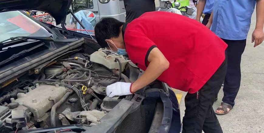 8月14日中午13.00,接到廠部電話通知,因疫情來揚(yáng)州支援的南京公務(wù)車輛因水溫過高而無法行駛停在⻄區(qū)大潤發(fā)停車場 ,得知情況后許學(xué)仁又主動(dòng)請(qǐng)纓前去搶修,他立即與車主取得了聯(lián)系并向車主詢問車輛故障現(xiàn)象,隨后和同伴馮琪準(zhǔn)備好工具便出發(fā)。趕到現(xiàn)場后,他們對(duì)⻋輛進(jìn)行了檢修,從而發(fā)現(xiàn)水箱爆裂導(dǎo)致水溫升高,隨即聯(lián)系配件供應(yīng)商,但因疫情和道路管控原因配件無法送達(dá),許學(xué)仁自己開車去尋找配件,一同前往的機(jī)修工馮琪便開始對(duì)水箱進(jìn)行拆解,兩邊同時(shí)進(jìn)行著,展開了一場與時(shí)間賽跑的“搶修戰(zhàn)役”,當(dāng)回到救援地點(diǎn),水箱以拆解好等待安裝,他倆便開始安裝,裝配完畢后開始試車與檢查水溫,水溫正常且風(fēng)扇完美轉(zhuǎn)動(dòng),車輛得已運(yùn)行,他兩露出了開心的笑容。