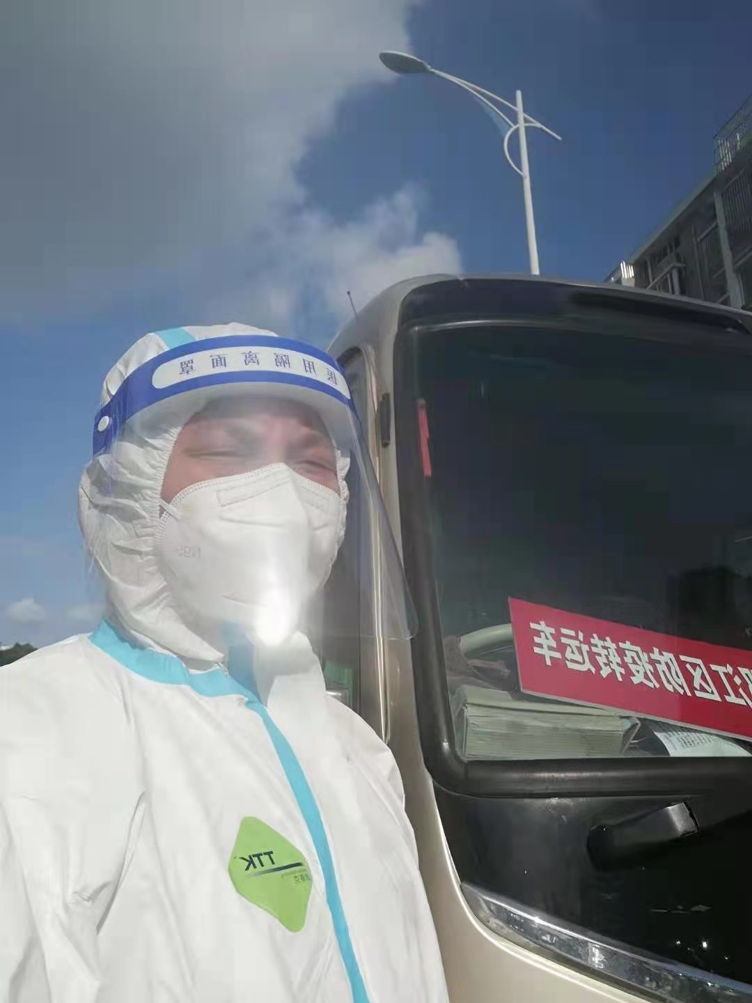 轉(zhuǎn)運工作異常艱苦,尤其是轉(zhuǎn)運初期,大量的人員需要轉(zhuǎn)運至隔離區(qū),畢克駐在一線全天24小時待命,接到任務(wù)立即穿戴防護(hù)服出發(fā),最多的時候每天轉(zhuǎn)運15趟次,只能睡三四個小時。疫情就是命令,生命重于泰山,防控的過程,就是與時間賽跑的過程。7、8月份正值高溫酷暑,他穿著封閉的防護(hù)服,一遍遍的從小區(qū)將次密者送到隔離點,每轉(zhuǎn)接一次,就要換一身防護(hù)服,渾身的汗水揮發(fā)不掉,硬是悶在密閉的防護(hù)服中,一天下來,皮膚被汗水浸泡的發(fā)白,手掌反復(fù)蛻皮。高溫高濕的環(huán)境、高強(qiáng)度的工作所帶來的考驗一般人難以忍受,而他卻日復(fù)一日重復(fù)著同樣的經(jīng)歷。