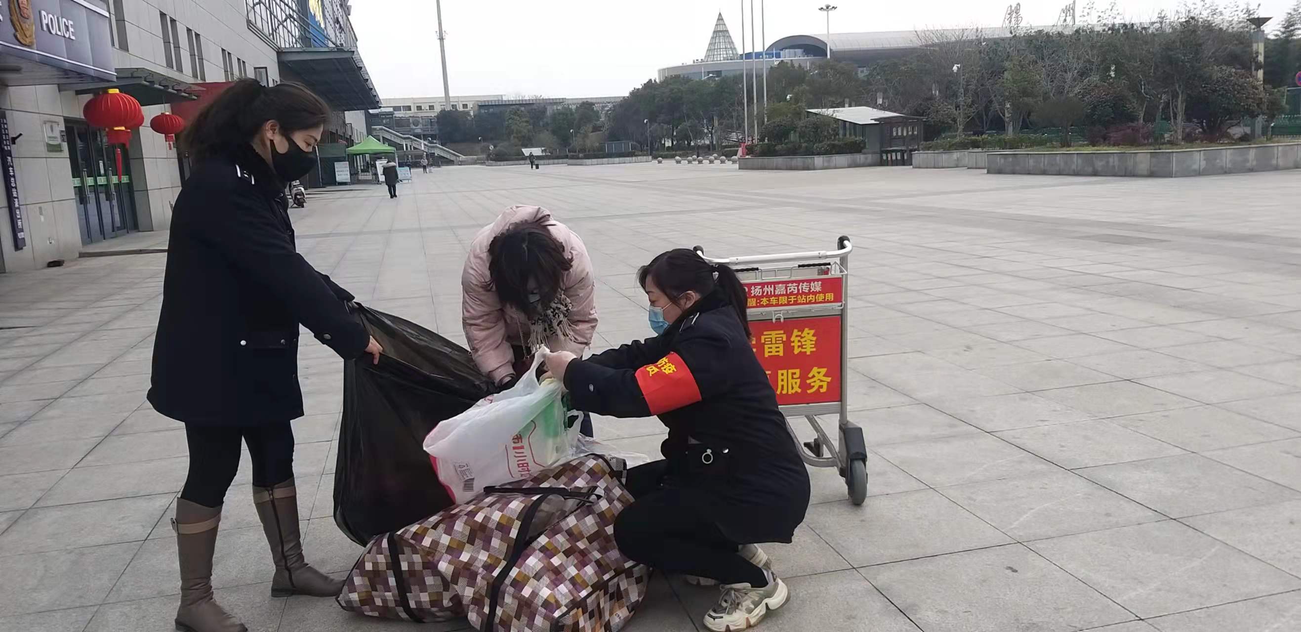 1月29日下午4點(diǎn)時分,西部客運(yùn)樞紐揚(yáng)州汽車站務(wù)中心工作人員殷丹和薛揚(yáng),日常工作巡查時,在站前廣場進(jìn)口處,看到一名旅客蹲在地上,手里抱著散落一地的行李無計(jì)可施,焦急萬分。