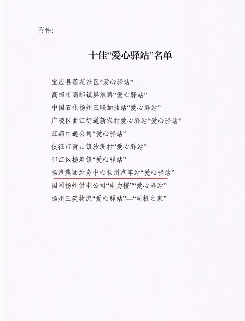 近日,揚州市總工會印發(fā)《關于命名2022年度十佳“愛心驛站”的通報》,揚汽集團站務中心揚州汽車站榮獲十佳“愛心驛站”榮譽稱號。