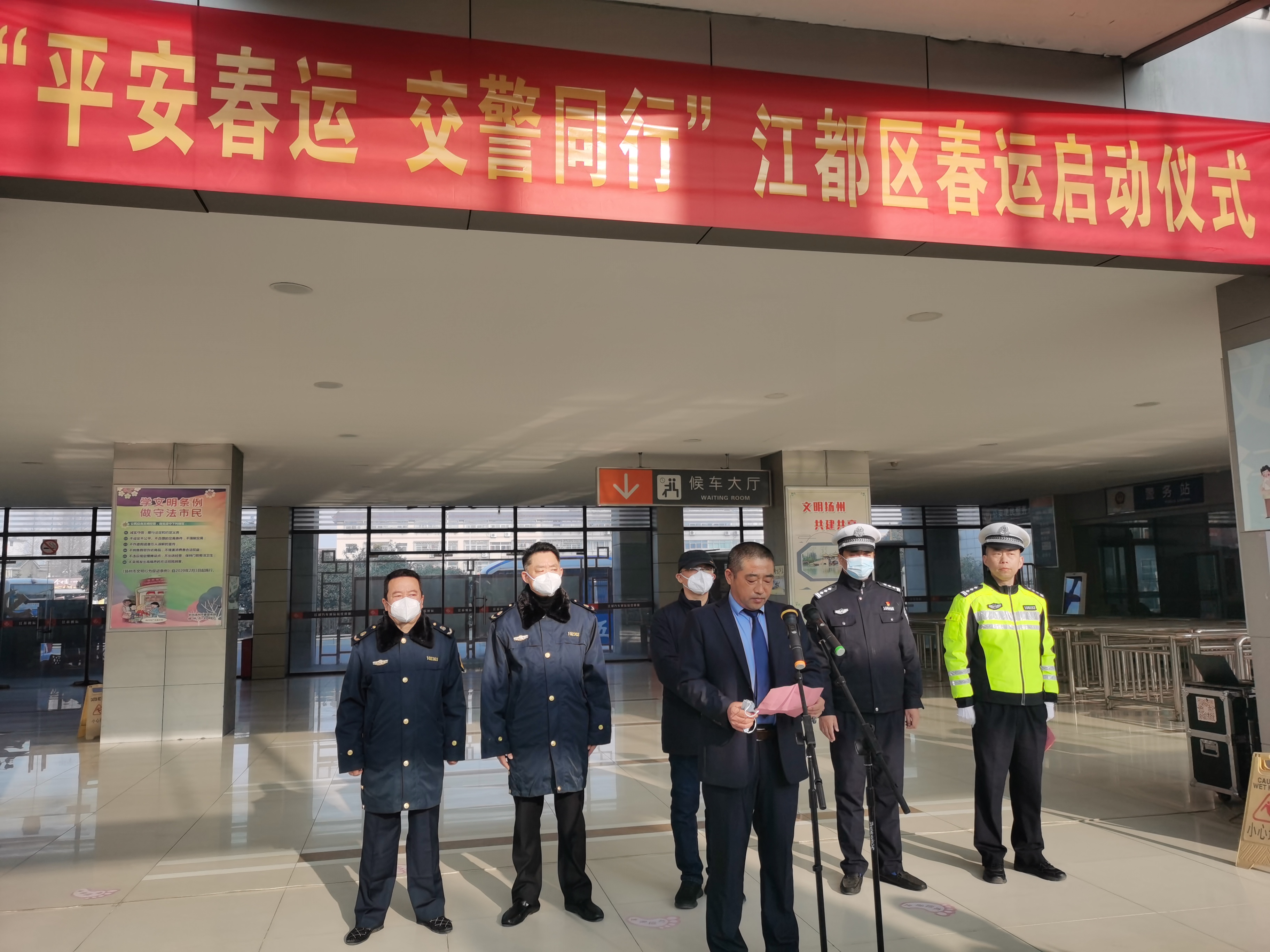 1月7日,2023年“平安春運(yùn) 交警同行”啟動(dòng)儀式在江都汽車(chē)客運(yùn)站售票大廳內(nèi)舉行。江都區(qū)公安局副局長(zhǎng)、交警大隊(duì)大隊(duì)長(zhǎng)宦新宇,江都區(qū)交警大隊(duì)車(chē)管所所長(zhǎng)滕斌,揚(yáng)汽集團(tuán)相關(guān)負(fù)責(zé)人參加活動(dòng)。