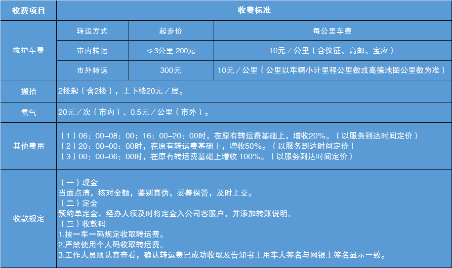 綜合衡量患者病情、轉運距離、設備和人員配備等因素,目前非院前急救收費標準如下: